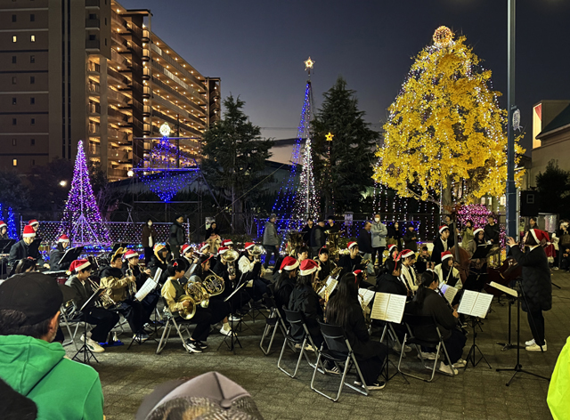 【東近江】 JR能登川駅前の西口広場を彩るイルミネーション「NOTOイルミ」の点灯式が先月29日にあった。地元能登川中学校吹奏楽部による演奏が花を添え、辺りはクリスマスムード一色に染まった。