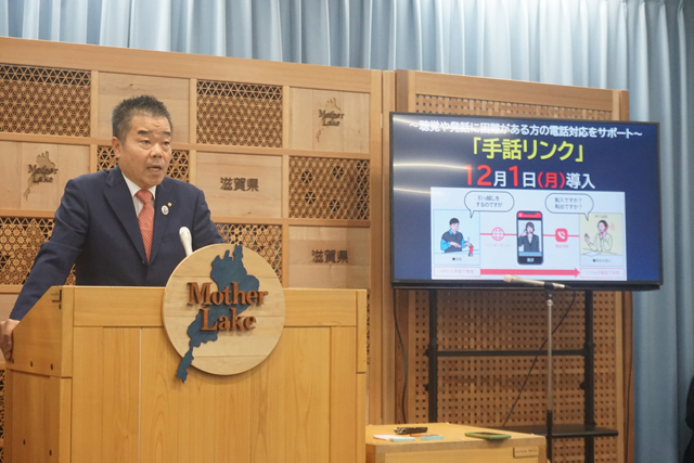 定例記者会見で「手話リンク」導入について紹介した三日月大造知事は「まず、総合案内と障害福祉課で導入してみて、それ以外の導入の必要性などについても検討する」と述べている。