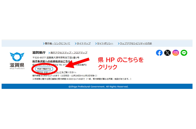 利用方法は、県ホームページ(https://www.pref.shiga.lg.jp/)トップ画面の下部の「手話で電話する」ボタンを押すことで利用できる。総合案内を経由して問い合わせ内容に応じた各課室に電話が転送されても、引き続き通訳オペレーターを介してやり取りすることができる。