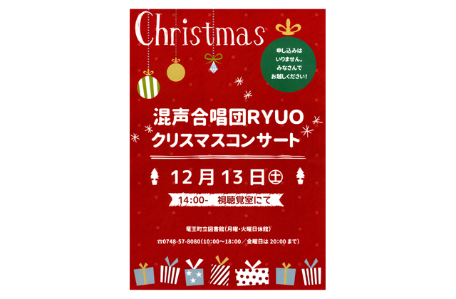 【竜王】 竜王町立図書館視聴覚室で13日午後2時から「混声合唱団RYUO クリスマスコンサート」が開かれる。