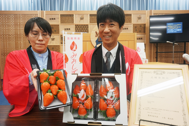 県では、16年から県農業技術振興センター(近江八幡市安土町大中)でオリジナル品種のイチゴ育成に取り組み、5年間かけて約1600品種から1品種を選抜。22年から農業者による栽培を開始した。当初、栽培面積は県内0・13ヘクタールで市場出荷量は10トンだったが、年々、栽培農家が増加、今年度は県内約4・4ヘクタールで栽培され、45トンの出荷を見込んでいる。また、出願から4年を経て今年10月、正式に品種登録された。