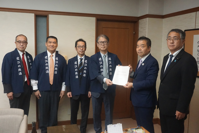 【全県】 県内30の酒蔵で構成する滋賀県酒造組合の松瀬忠幸会長(松瀬酒造、竜王町)と福井毅副会長(福井弥平商店、高島市)、中井孝理事(浪乃音酒蔵、大津市)らがこのほど、組合を代表して県公館(大津市京町4)を訪問し、三日月大造知事に「酒造好適米の価格高騰に関する支援」を要望した。