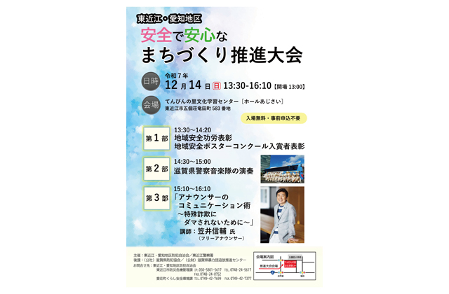 問い合わせは、東近江・愛知地区防犯自治会がある東近江市防災危機管理課(TEL0748―24―5617)か、愛荘町くらし安全環境課(TEL0749―42―7699)へ。