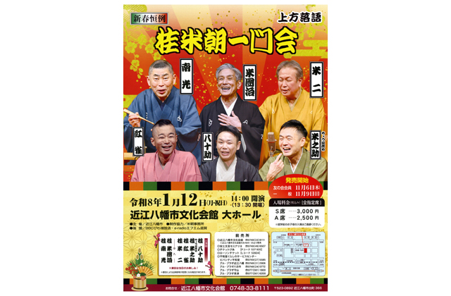 出演は、桂八十助、桂米之助、桂紅雀、桂米二、桂米團治、桂南光の6人で、演目は当日のお楽しみ。入場料金S席3千円、A席2500円。同会館、文芸セミナリヨのほか、平和堂くらしのサービスセンター、チケットぴあ、ローソンチケットで発売中。