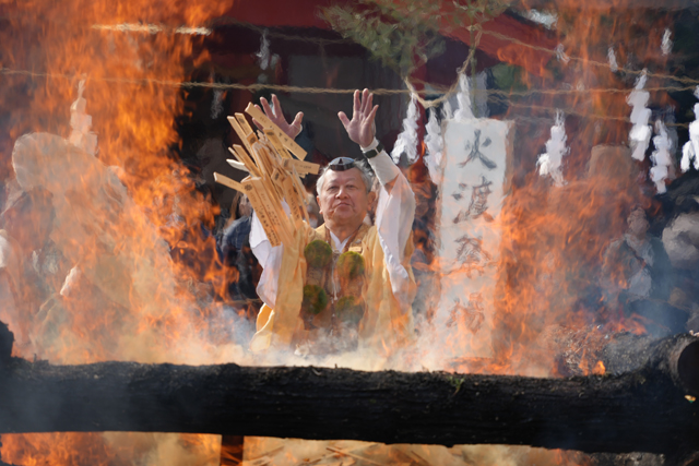 【東近江】無病息災や心願成就を神木の火に祈る太郎坊宮(東近江市小脇町)の神事「お火焚大祭」が7日、同宮で営まれた。神事や山伏問答の儀式の後、聖火が護摩壇に点火されると、瞬く間に白い煙が辺り一帯を包んだ。煙は神煙と言われ、浴びると心身が清らかになるとされる。護摩壇を囲むように埋め尽くした参拝者らは、立ち上がる神煙に祈りを込めて手を合わしていた。その後、全国の信者や氏子から寄せられた数万本の護摩木が火に投げられ、成就を祈願。最後に焚く木の上をはだしで歩く火渡り神事で今年一年の汚れを焼き払い、新年の多幸を祈った。