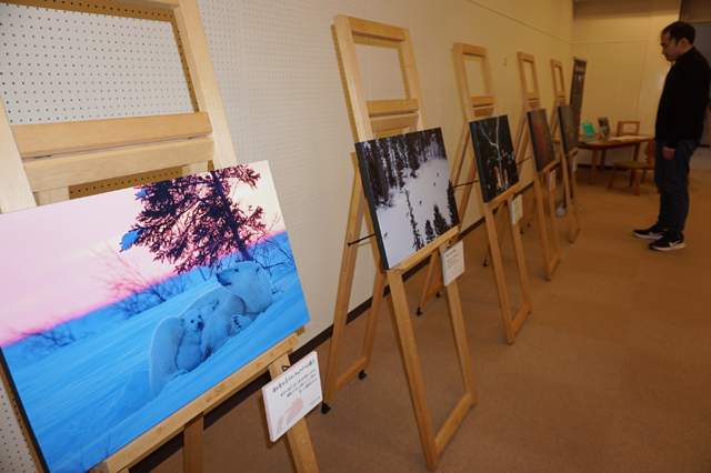 会場の展示作品は約35点。このうち、夕暮れに身を寄せ合うホッキョクグマの親子を撮影した作品は、2015年2月、巣穴から生後3カ月の子グマが地上に姿を現わすのを待って撮影した。