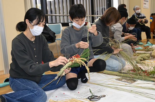 同市の「文化遺産としての松明を次世代に贈る会」が、地元に受け継がれてきたわら細工の伝統技術の一端をしめ縄づくり体験を通して学び、新年を迎える日本古来の伝統文化に親しんでもらおうと毎年、開いている。