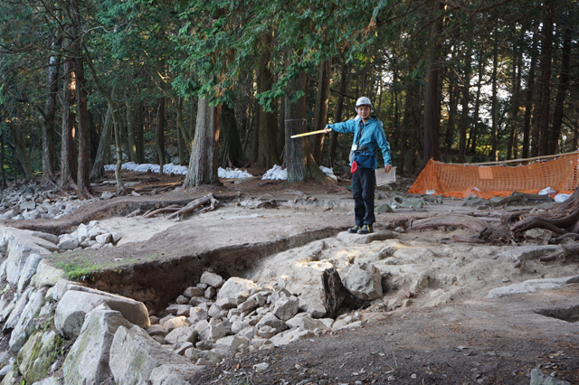調査では、本丸取付台の中央部と東側を区分けする石列が昨年に続いて見つかり、さらにその東側で東西約30メートル、南北約10メートルにわたって、一辺80センチ程度の建物礎石が21個検出された。