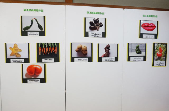 今年は県内外から66点の応募が寄せられた。ソフトクリームのようにうずを巻いたオクラやくちびるのような形をしたイチゴ、ウサギの耳のような形をしたカキなどがエントリーされ、訪れた来場者が思わずくすりと笑ってしまうユーモアあふれる作品がずらりと並んでいる。