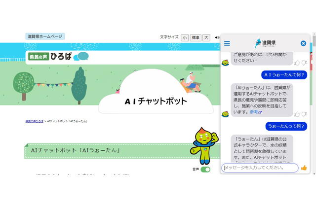 AIチャットボットとは、入力した質問に対し、内容や意図を解釈して自然な会話の形式で即時返答するプログラムのこと。「AIうぉーたん」は、県のホームページの情報や「知事への手紙」などを学習し、その内容を元に回答する。また、時々「AIうぉーたん」から質問することもある。