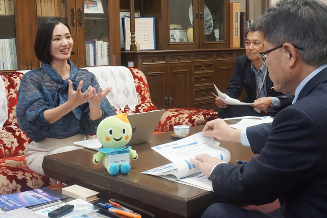【県】 県が10月にホームページ(https://www.pref.shiga.lg.jp/)内の「県民の声ひろば」と「子ども県民の声ひろば」に導入したAIチャットボット「AIうぉーたん」について、このほど同チャットボット開発事業者「ビースポーク」(東京都)の綱川明美代表が県庁で東勝副知事を表敬訪問し、導入から1か月の動向や今後の広聴とAIの可能性について対談した。