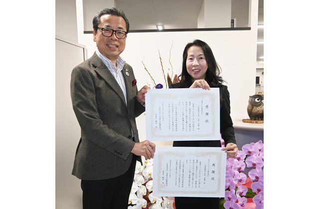 感謝状を贈られた児島多鶴子代表取締役は「近江八幡での創業当時からびわ湖の環境保全活動に取り組んでおり、今回、お話をいただいて、微力ながら協力させていただくことになりました」と話した。