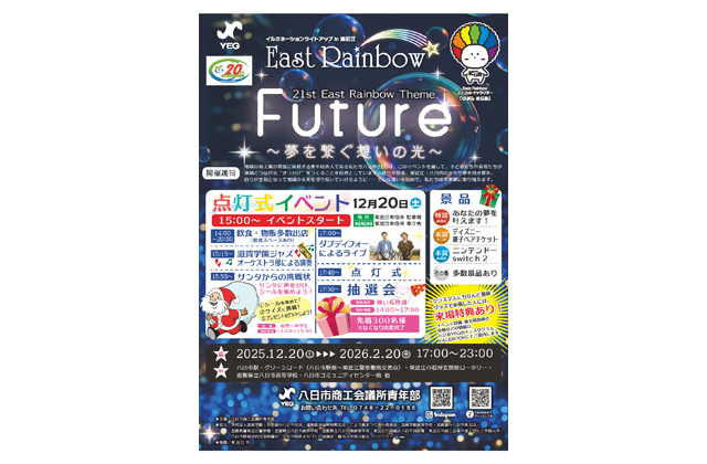 まちのにぎわい創出や地域経済の活性を目的に、八日市商工会議所青年部が東近江市の誕生を機に始めたイルミネーション。21回目を迎えた今年のテーマは「Future~夢を繋ぐ想いの光~」。地域の絆をさらに深め、子どもたちや若者たちが「ふるさと」への誇りと愛着を育むきっかけにと願いが込められている。