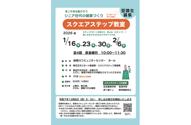 【東近江】 能登川コミュニティセンターは、来年1月から開くシニア世代の健康づくり「スクエアステップ教室」の参加者を募集している。