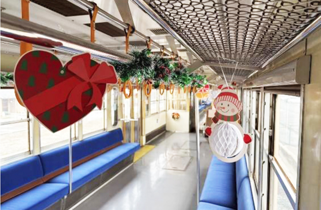 【東近江、彦根】 近江鉄道は25日まで、クリスマスの季節にあわせて、900形「あかね号」の車内を装飾した「メリークリスマス号」を全線で運行している。通常運賃でだれでも自由に乗車できる。運行時刻は毎日変わる。