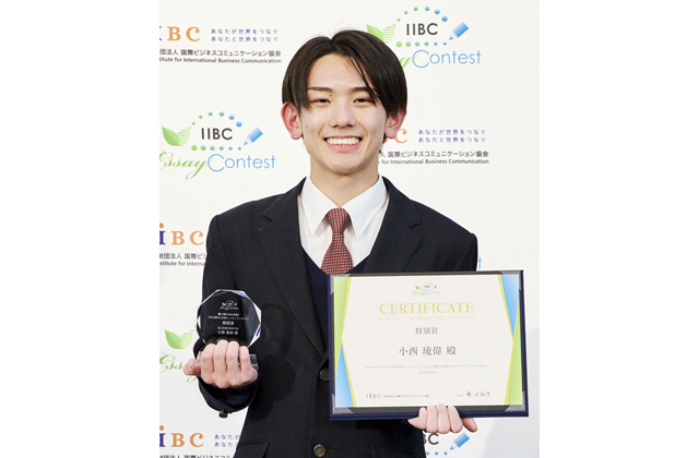 【近江八幡】TOEICプログラムを実施運営する国際ビジネスコミュニケーション協会(IIBC)が主催した「第17回IIBC高校生英語エッセイコンテスト」(後援・文部科学省、外務省)の個人部門で近江兄弟社高校3年生、小西琉偉さんが「特別賞」を受賞。先月23日、ホテルニューオータニ東京で表彰式が行われた。