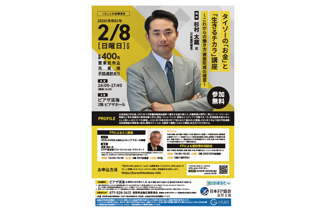 【東近江】 くらしとお金講演会「タイゾーの『お金』と『生きるチカラ』講座」が来年2月8日午後4時から、ピアザ淡海(大津市)で開催される。滋賀県金融広報委員会と日本FP協会滋賀支部、金融経済教育推進機構の共催。
