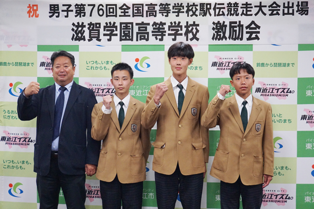 【東近江】 11月に開かれた全国高校駅伝競争大会滋賀予選で優勝し、きょう21日に京都で開催される全国高校駅伝に出場する滋賀学園高校の陸上競技部男子を応援しようと、東近江市主催で激励会が17日、市役所で開かれた。