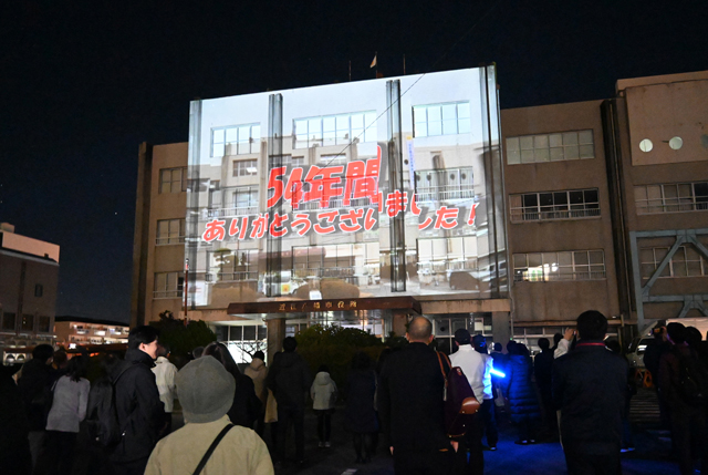 プロジェクトマッピングは、同クラブから依頼を受けた八幡工高電気科の生徒が製作。近江八幡の歴史文化、美しい風景、伝統行事などを織り交ぜ、市庁舎とともに発展してきた近江八幡のまちの変化を今昔の写真で対比しながら歴史を振り返る映像を完成(1971年10月1日)から54年間、市行政の拠点としての役割を果たしてきた市庁舎正面玄関上の壁面全面に映し出した。