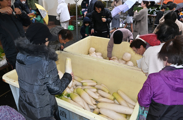 農家や家庭菜園を楽しむ家庭からは、食べきれない野菜の有効利用が図れるとして協力が相次ぎ、大根やカブラ、白菜、カボチャなどのほか、はっさくやレモン、黒大豆など合わせて10種類以上の野菜が提供され、提供量が多かった大根とカブラは全世帯に、その他は抽選で配布した。
