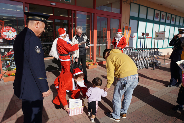 クリスマス間近ということで、同支部員がサンタクロースに扮し、同支部考案の「わがやでは ゆうげの話題 交通安全」の標語シールを添付した啓発品(ゆうげの味噌汁)と啓発チラシを来店者に配布した。
