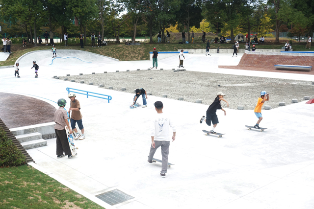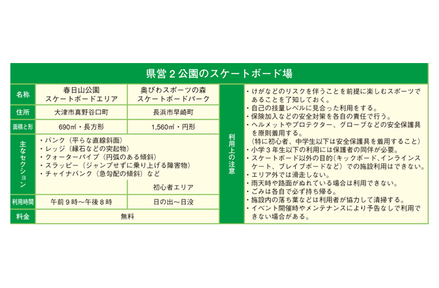 【大津・長浜】 県は昨年県営公園としては初となるスケートボード場を春日山公園(大津市真野谷口町)と奥びわスポーツの森(長浜市早崎町)の2か所にオープン。昨秋は、様々な世代が思い思いにスケートボードを楽しむ姿が各公園で見られた。