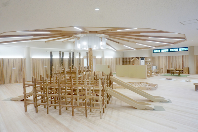 施設内は、ダイナミックに広がる木の空間で様々な木の玩具で遊べるメインスペースをはじめ、柔らかい杉材をフローリング床にした赤ちゃんスペース、木育研修や工作、会議などに使えるワークショップ室とまなびスペース、のぞき小窓やトンネルなど子どもたちが入り込んで遊べるスペースなどを設け、回遊しながら遊べるように設計された。