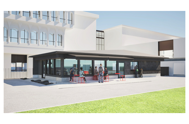 芝生エリアの一角に新設する飲食店は、木造平屋で延床面積約120平方メートル。席数30~40席。収納式の庇(ひさし)のオーニングを備えており、テラス席で公園を眺めながら飲食ができる。