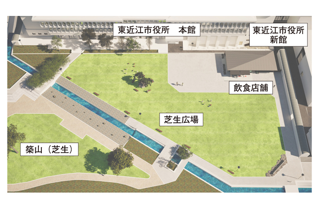 計画では、「みんなが憩い、集う、街のオアシス」をコンセプトに、水路を挟んで市役所側に飲食店を新設する芝生エリア(約3200平方メートル)、南側に築山エリア(約2500平方メートル)が整備される。
