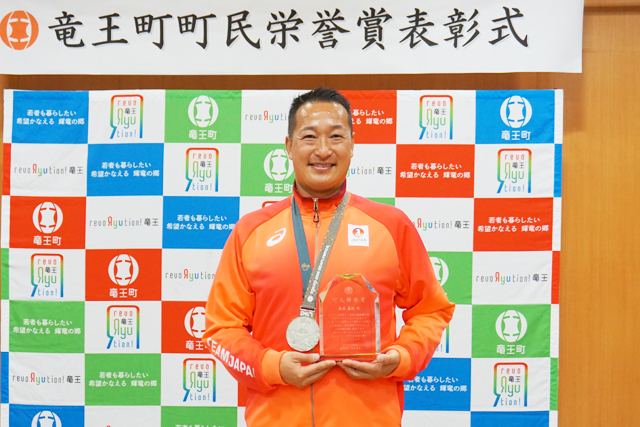 【竜王】 竜王町はこのほど、2025年夏季デフリンピック男子ハンマー投げ(11月)で銀メダルを獲得した同町山之上在住の森本真敏選手(40)に第1号の町民栄誉賞を贈った。