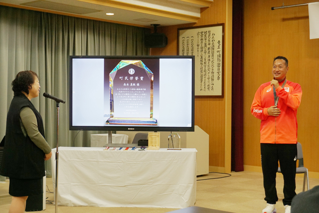 表彰式で西田秀治町長は「国内外で輝かしい成績を修められている森本さんに町民を代表して町民栄誉賞をお贈りできることは大変な誇り。長年に渡り厳しい鍛錬を積み上げられ、競技に向き合う真摯(しんし)な姿勢のたまものだと思います。ぜひとも町の子どもたちにも努力することの大切さや、夢に挑戦することの素晴らしさを伝えていってもらいたい」と期待を込めた。