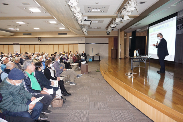 【東近江】 肺炎死亡者の98%は、65歳以上の高齢者といわれる。「地域で守る肺の健康~みんなで取り組む肺炎予防~」をテーマに東近江市シルバー人材センター主催の安全講習会が24日開催され、肺を鍛える「呼吸リハビリ」の第一人者で、びわこリハビリテーション専門職大学(東近江市)の千住秀明教授が、肺の健康を守るための知識と技術、フレイル(加齢に伴う心身低下)と呼吸の関係性、呼吸器疾患のリハビリテーションをわかりやすく紹介した。会員約200人が参加した。