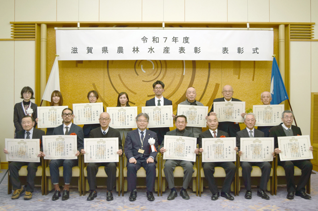 ◆功労賞=▽田中治嗣さん(67、草津市、農業)▽黒田為三さん(69、甲賀市、農業)▽湯ノ口孝生さん(73、東近江市、農業)▽川南善明さん(72、東近江市、農業)▽近藤章さん(74、彦根市、農業)▽廣部重嗣さん(66、長浜市、農業)▽小島秀喜さん(67、高島市、農業)▽平山次夫さん(74、高島市、水産)▽奥嶋健次さん(73、甲賀市、林業)▽田邊由喜男さん(68、彦根市、林業)。