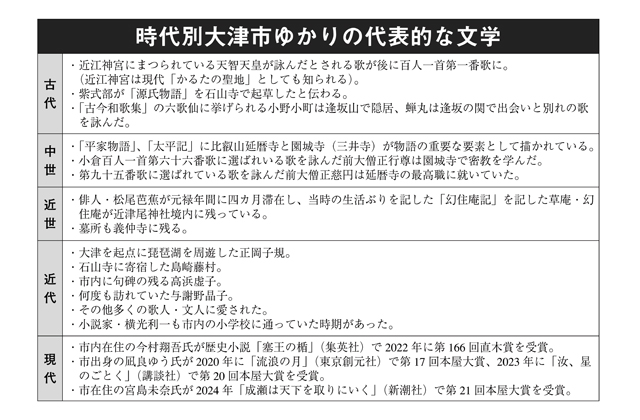 市によると、軍記物「平家物語」や「太平記」には比叡山延暦寺(同市坂本本町)と園城寺(三井寺)(同市園城寺町)が物語の重要な要素として登場すること、松尾芭蕉が当時の生活ぶりを記した「幻住庵記」を書いた幻住庵(同市国分2)や墓所のある義仲寺(同市馬場1)があること、そして、現代でも市内在住で第166回直木賞を受賞した今村翔吾氏や第17回と第20回の本屋大賞を受賞した同市出身の凪良ゆう氏、第21回同賞を受賞した同市在住の宮島未奈氏など、活躍を続ける作家もいるなど各時代を通じて文学とゆかりが深い土地であることが分かった。