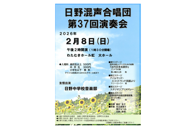 【日野】 日野混声合唱団の「第37回演奏会」が2月8日午後2時から、わたむきホール虹大ホールで開かれる。