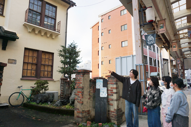 今回は、同大学の学生14人のほか、滋賀学園高校9人が参加して開催。学生が考案した地元の魅力がわかるボードゲームを市役所で楽しんだあと、いくつかのグループに分かれて八日市駅前を散策し、気になる建物の前で立ち止まったり、店舗で休憩をとりながら高校生の進路相談にのるなどして交流を深めた。