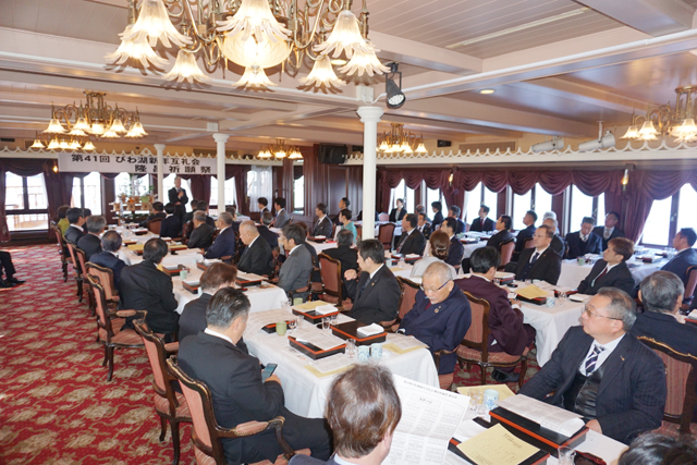 【東近江】 琵琶湖上で賀詞を交歓する第41回びわ湖新年互礼会(滋賀報知新聞社、滋賀中部政経文化懇話会主催)が8日、観光外輪船ミシガンで開かれた。三日月大造知事はじめ、各自治会の首長や議員、経済・産業・文化などの県内各界のリーダーら約100人が出席し、今年の抱負を語った。