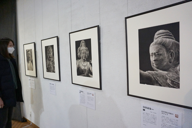 見どころの一つが、国宝・阿修羅像(興福寺)などの京都・奈良の仏像写真をもとにした印画作品10点(遺族より寄贈)。太平洋戦争が敗戦濃厚となっていた1944年、長谷川から写真技術を学んでいた皇族の李王殿下から「戦火で失われる可能性に備えて、仏像を記録しておきたい」との依頼を受け、撮影したもの。