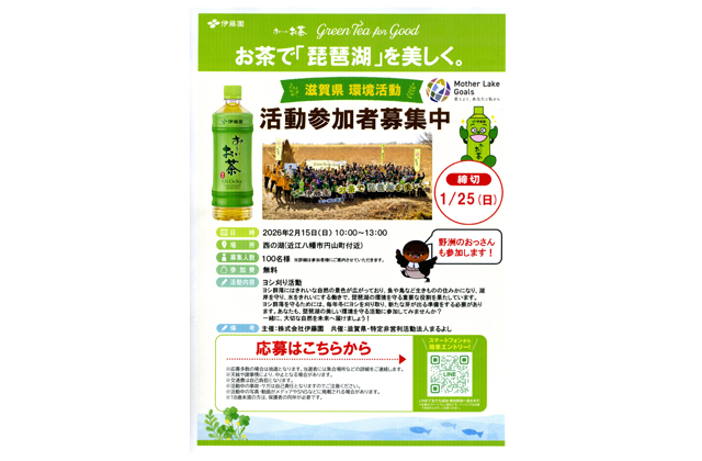【近江八幡】「お~いお茶」を製造販売する(株)伊藤園は、滋賀県などと共催して2月15日午前10時から午後1時まで近江八幡市円山町付近の西の湖で行う「よし刈り活動」の参加者を募集している。