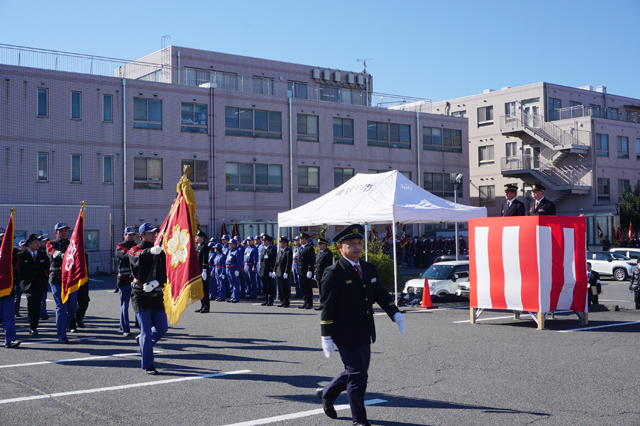 式典と分列行進・一斉放水で今年一年の士気を高める