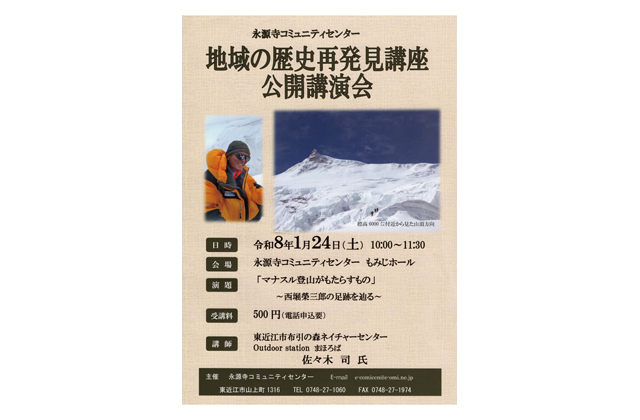 【東近江】 永源寺コミュニティセンターは24日、昨年9月にヒマラヤ山脈のマナスル(標高8163メートル)に登頂した東近江市在中の佐々木司さんの講演会「マナスル登山がもたらすもの~西堀榮三郎の足跡を辿る~」を開き、参加者を募集している。