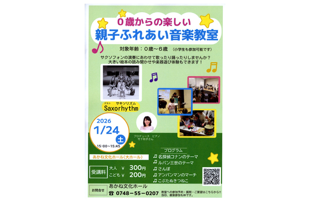 【東近江】 東近江市あかね文化ホール(東近江市市子川原町)で24日午後3時から「0歳からの楽しい親子ふれあい音楽教室」が開かれる。