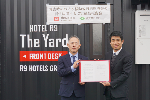 【日野】 日野町と株式会社デベロップ(本社・千葉県)はこのほど、同社が運営する新型コンテナホテル「HOTEL R9 The Yard 蒲生日野(ホテル アールナイン ザ ヤード ガモウヒノ)」(同町松尾)の開業にともない、「災害時における移動式宿泊施設などの提供に関する協定」を締結した。