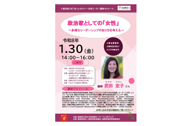【近江八幡】県立男女共同参画センター(近江八幡市鷹飼町)で30日午後2時から第4回G―NETほっとセミナー「政治家としての女性~多様なリーダーシップのあり方を考える~」が開かれる。