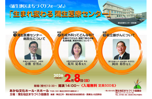 【東近江】 蒲生地区まちづくり協議会は、2月8日午後2時からあかね文化ホール(同市市子川原町)で「蒲生地区まちづくりフォーラム生まれ変わる蒲生医療センター」(後援=東近江市、蒲生地区自治会連合会、医療法人社団昴会)を開催する。