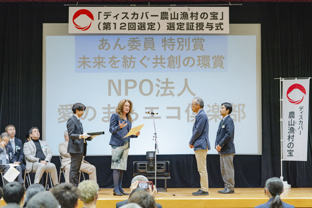 全国454件の中から、優良事例30地区が選ばれ、昨年12月19日に農水省講堂で選定証授与式が行われた。また愛のまちエコ倶楽部は、選定にあたった有識懇談会の委員、あん・まくどなるど氏(上智大学大学院教授、環境史・環境政策)から特別賞(未来を紡ぐ共創の環賞)を受賞した。