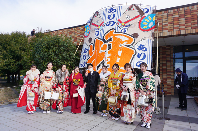 なお、新成人による20畳敷東近江大凧飛揚は強風のため中止された。大凧は、式典会場の八日市文芸会館正面に展示され、多くの新成人が記念写真を撮影していた。
