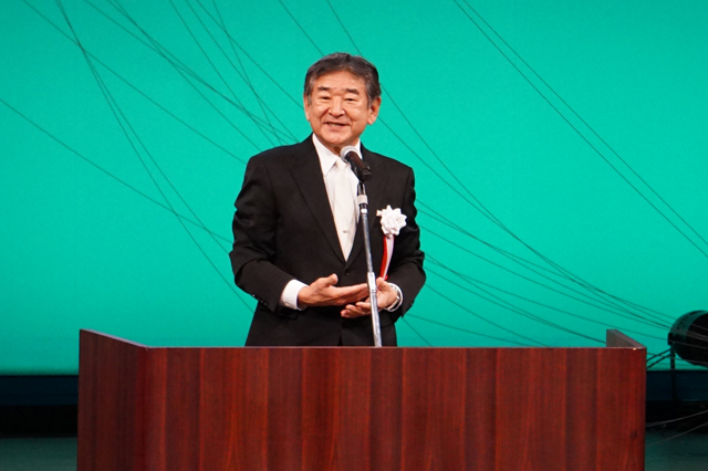 式典のオープニングでは、中学校の先生や市内施設からのお祝いメッセージの動画が映され、出席者から喜びの声が上がっていた。