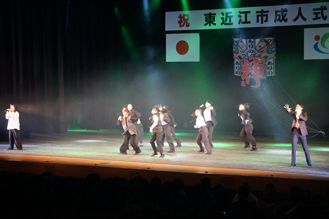 小椋正清市長は式辞で、今年復活を目指している東近江大凧の100畳敷大凧飛揚に触れて、「この大凧は地域の人々が力を合わせて製作された。1人では成しえないことも、多くの人の思いと支えがあれば大きな形となる。その姿は、これから社会へ羽ばたいていく皆さんの姿と重なる。1人の力は小さく感じるかもしれない。しかし、ここにいる皆さん1人1人が社会をより良くする意識をもって行動すれば、その力は必ず大きなうねりとなり、社会をより良い方向へ導いてゆくことができる。皆さんは自分1人の力に頼らずに、周囲と支え合い、学び合いながら、成人式実行委員会が製作した東近江大凧の判じ文のように“ありのまま 輝く”、自分らしい道を歩んでください」と、大人の仲間入りをした新成人へエールを送った。