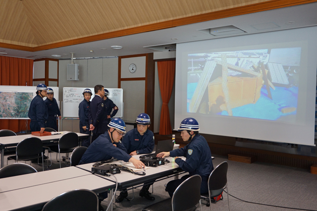 署員らは110番通報から届く災害被害や交通整備などの情報を迅速に取りまとめ、リアルタイムで送られてくる救助活動の映像をもとに現場をサポートするなど各種連携を確認した。